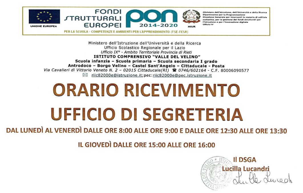 ORARIO RICEVIMENTO UFFICI DI SEGRETERIA